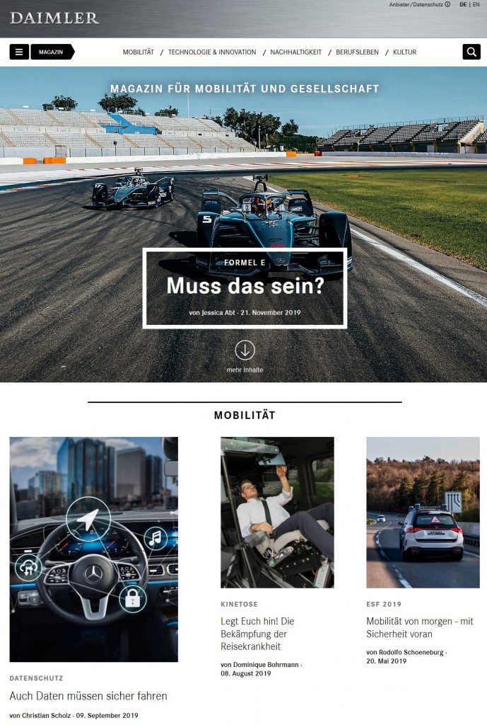 Stattdessen sollen professionelle Autoren das neue Daimler-Magazin mit gesellschaftsrelevanten Titelgeschichten beleben. Alle zwei Wochen werden Beiträge rund um Mobilität, Technologie und Innovation sowie Berufsleben, Kultur und Nachhaltigkeit veröffentlicht. Abwechslung bieten kleinere, unterhaltsame Formate. Zusätzlich sollen die Geschichten vertont werden. So greife man das derzeit beliebte Podcast-Format mit auf. Bewusst wird im Daimler-Magazin auf die Kommentarfunktion verzichtet. Die Diskussion wird stattdessen auf das LinkedIn-Profil ausgelagert und somit noch transparenter gestaltet, als es das Blogformat allein erlaubte.