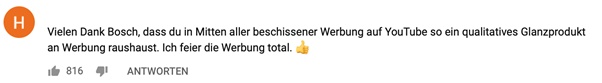 Das Traditionsunternehmen Bosch hatte das Ziel mit #likeabosch das staubige Markenimage zu erneuern, um sich jung und frisch als Front-Runner zum Thema Internet of Things zu positionieren. Der Werbespot zeigt einen nerdigen Typen, der unter dem Motto „like a bosch“ seinen – digital vernetzten – Tagesablauf rappt. Der Werbespot kommt auch bei den Nutzern sehr gut an, wie einige Kommentare auf YouTube verraten. Das zeigt, dass mutige und lustige Content Marketing Kampagnen, die den Zeitgeist treffen, hohes Erfolgspotential haben.