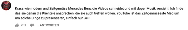 Mit seiner Youtube-Serie #letsdrivemercedes versucht der deutsche Automobilhersteller, seine Zielgruppe mit viel Humor und Expertise zu erreichen. Die deutschen Automagazin-Moderatoren Jean Pierre Kraemer und Matthias Malmedie testen darin die verschiedenen Mercedes-Modelle und das mit Erfolg. Die Videos erzielten bis zu 2,3 Millionen Klicks. Durch die Anwesenheit von zwei Moderatoren, die Auto-Fans so schon von YouTube kennen, plus die Aufmachung der Werbung wie ein Auto-Test-Format, entsteht Authentizität. Mercedes hat mit dem Format genau den Zahn der Zeit getroffen und erntet Lob dafür: