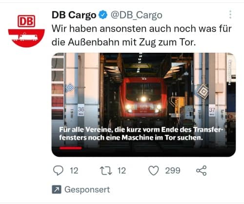 Twitter-Anzeige von DB Cargo mit einer Anspielung auf das Ende des Transferfensters der Fußball-Bundesliga am 31. August (Screenshot: 30.08.2021)