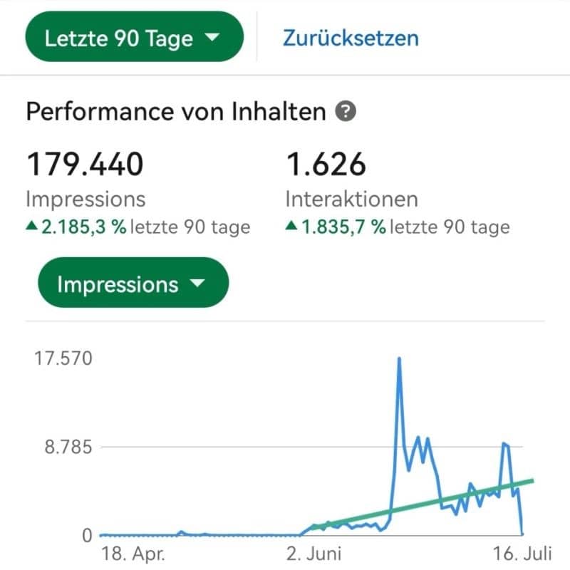 📍 Ich habe am 1. Juni 2022 mit dem Posten in LinkedIn gestartet. Die ersten ca. 18 Tage ist erst einmal nichts Spektakuläres passiert. Dann, am 19. Juni, geschah das Unerwartete. 💥 Ein Beitrag ging viral. Das hat sich bereits in der ersten Stunde nach der Veröffentlichung abgezeichnet. Der Beitrag hatte schon da 500 Impressionen und nahm am zweiten Tag richtig Fahrt auf bis auf 17.500 Impressionen.