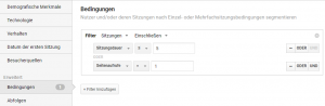 Nutzergruppen analysieren: Durch das Anlegen von Segmenten lassen sich die drei Nutzergruppen leicht in Web-Analyse-Systemen identifizieren. Hierzu z.B. in Google Analytics ein „Segment hinzufügen“, anschließend „Neues Segment“ wählen und unter „Bedingungen“ die gewünschten Engagement-KPIs zusammenstellen.