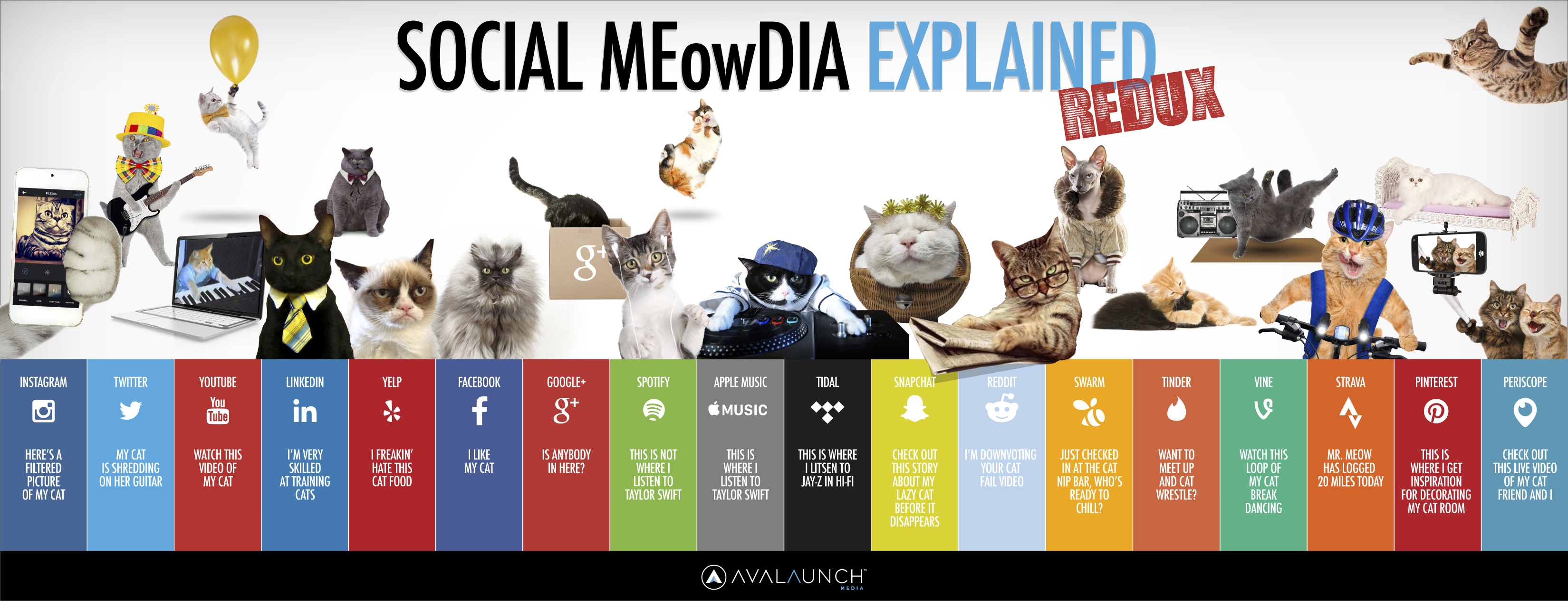 Was ist Social Media? Das kann für Online-Marketer eine ziemlich eigenartige Frage sein, für Vertreter anderer Berufssparten ist die Welt der sozialen Netzwerke manchmal schon verwirrend, unübersichtlich und schwer zu erklären. AVALAUNCH Media hat eine ziemlich witzige Infografik entworfen, die verschiedenen Social Media Kanäle, wie Pinterest, Spotify oder Google+, erklärt, vor allem für Katzenliebhaber schnell und einfach zu verstehen.