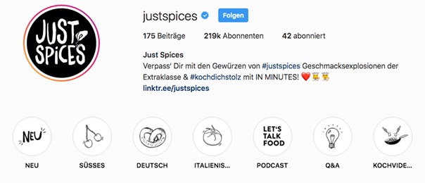 Klar, die Biografie, die neben dem Profilbild steht, ist die erste Information für den User. Um interessierten Besuchern auf Deiner Instagram-Page aber noch mehr Einblick zu gewähren, solltest Du die Highlight-Funktion nutzen. Eigentlich sind Story-Posts nach 24 Stunden nicht mehr sichtbar, doch dank der Highlights kannst Du ausgewählte Posts auch über diesen Zeitraum hinaus auf Deiner Page platzieren. Dort bietet es sich an, Awareness-Content für all jene zu bieten, die nicht so genau wissen, was Dein Unternehmen ausmacht und eigentlich tut. Just Spices macht dies per Produktdemonstrationen und in den Q&As werden wichtige Fragen beantwortet. Doch auch Impressionen des Arbeitsalltags, eine Team-Vorstellung oder die Unternehmensgeschichte bieten sich als Highlight-Stories an.