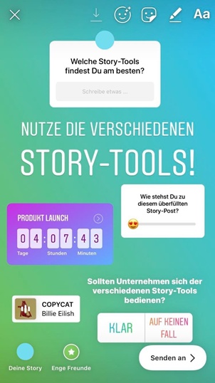 Da es in Stories keinen klassischen Like-Button gibt, geht ein wichtiger Erfolgsparameter verloren. Um diesen Verlust zu kompensieren, solltest Du regelmäßig auf User-Engagement setzen, indem Du Dich der diversen Story-Tools bedienst. Welche genau dort zur Verfügung stehen, haben wir hier aufbereitet: