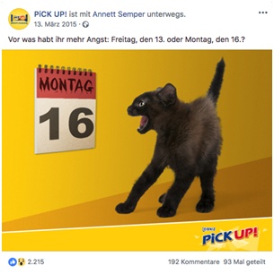 Schauen wir in die Übersicht der geposteten Bilder bei Facebook, können wir deutlich einen Wendepunkt in Sachen Content erkennen. Visuell lässt er sich an der Etablierung eines festen Corporate Designs mit gelbem Hintergrund und blauer Schrift erkennen. Die aber wohl gravierendere Änderung war die der Corporate Communication. Statt generischem Cat Content gibt es nun freundlich-provokante Posts, die gern auch mal gegen andere Marken schießen. Als erstes traf es Knoppers mit „Morgens halb 10 in Deutschland – bin ich noch nicht mal wach“. Damit legte Pick Up! mit über 15.000 Likes den Grundstein für einen Neuanfang in Sachen Kommunikation. Von nun an heißt die Devise: locker, frech, provokant – aber nie beleidigend. Diese Tonality zeigt sich sowohl in den Posts als auch im Community Management.