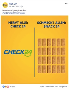 Nach dem Content-Wendepunkt im Oktober 2015 ist fast jeder Post ein Erfolg und die Like-Zahlen variieren von 2.000 bis zu 27.000 Likes (siehe Bild 3). Der Inhalt ist rein humoristisch, satirisch und kein Post kommt ohne auch nur einen kleinen Gag aus. Damit schafft Pick Up! einen komödiantischen Mehrwert für den Follower und wird nicht mehr als rein werblicher Marken-Account wahrgenommen. Ein weiterer Erfolgsfaktor: die häufige Bezugnahme auf das Zeitgeschehen und Popkultur wie beispielsweise das Dschungelcamp oder Pokémon.