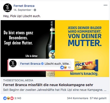 Zwar postete Pick Up! nach öffentlicher Anprangerung noch weitere drei Posts im Fernet-Branca-Sprech, doch diese blieben allesamt mit unter 100 Likes vermutlich weit unter dem, was sich die Werbetreibenden vorgestellt hatten. Seit Ende September dieses Jahres wurde es still auf der Facebook-Präsenz von Pick Up! (Stand: November 2018). Auffällig dabei: Auch auf den Facebook-Seiten von Leibniz und Bahlsen wurde es verdächtig ruhig. Vermutlich stecken interne Umstrukturierungen dahinter und bald erwartet die Communities vielleicht ja wieder der gewohnte, lustige Content, den sie in letzter Zeit vermisst haben.