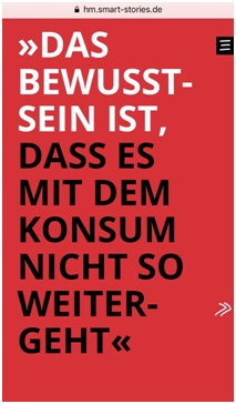 H&M macht einen weiteren Schritt in Richtung Imagewandel: In Kooperation mit der Münchener Content-Agentur smart stories präsentiert das Modehaus ein visuelles Storytelling-Format. Die dort behandelten Themen drehen sich rund um Nachhaltigkeit, Veränderung und Umwelt. Die Agentur stellt dabei nicht nur die technische Umsetzung in Form von einem mobile-first-Magazin bereit, sondern auch die journalistisch aufbereiteten Inhalte.