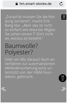 H&M und smart stories haben sich zusammengetan, um ein Content Erlebnis der besonderen Art zu schaffen. Die professionell aufbereiteten Inhalte wirken nicht werblich, sondern wie gut recherchierte, redaktionelle Artikel. Genau das ist auch der Mehrwert, der dem Leser geboten wird: interessante Inhalte über nachhaltige Projekte. Das Ganze wurde dann auch noch nach der Devise „Mobile First“ entwickelt und designt, was für eine ideale Usability sorgt.
