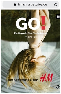 H&M Deutschlands Magazinreihe fand im Oktober 2018 ihren Anfang mit der ersten Ausgabe „Go!“. Die Themen variieren von Veränderung über nachhaltigen Konsum bis hin zu Recycling in der Modebranche. Drei weitere Magazine sind bereits geplant, deren Inhalte sich rund um die Mitarbeiter, Werte, Visionen und Innovationen des Modekonzerns drehen. Damit gewährt H&M einen Blick hinter die Kulissen und reflektiert vielleicht auch die Missstände in den Produktionsstätten. Mit dem 2014 eröffneten „Starting House“ in Berlin machte H&M bereits erste, große Schritte in Richtung Corporate Social Responsibility. Das Starting House ist ein Repräsentationsort für Nachhaltigkeit sowie Innovationen des Konzerns und daher auch der Initiator des Projekts.