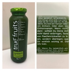 Auf der Vorderseite wirkt es wie ein braver, gesunder Drink für zwischendurch, auf der Rückseite kommt dann das wahre Gesicht zum Vorschein: Jeden Monat setzen sich die Kollegen in ihrem Bonner Büro zusammen und texten die Sprüche für die neuen Flaschen. Mit diesen kreativen Storys schaffte true fruits einen Bruch in der natürlichen Assoziation, die Verbraucher bei Smoothies haben. So denken die meisten bei einem gesunden Obst-Drink an eine familienfreundliche und gesunde Tonality, wie sie auch bei Konkurrenten wie innocent vorherrscht – eben der ganz glatte Instagram-Style.
